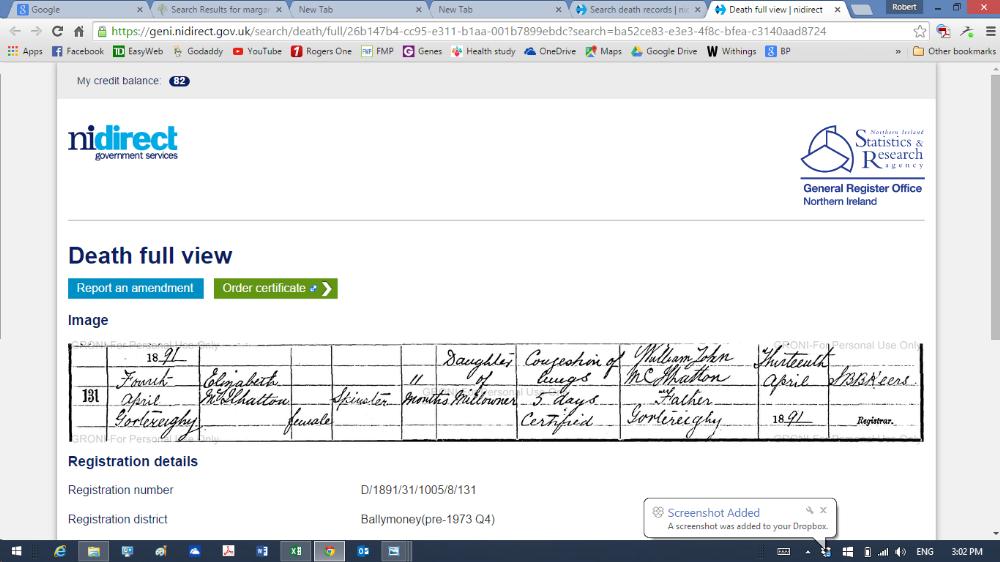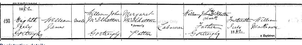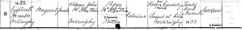 12. Margaret MCILHATTON, daughter of William John MCILHATTON and Margaret PATTON, was born on November 18, 1888 in Gortreighy.3 She died on December 1, 1888.