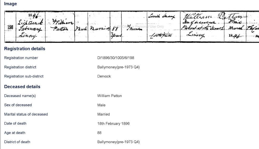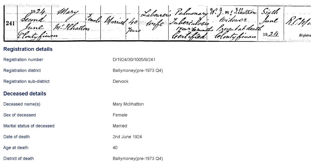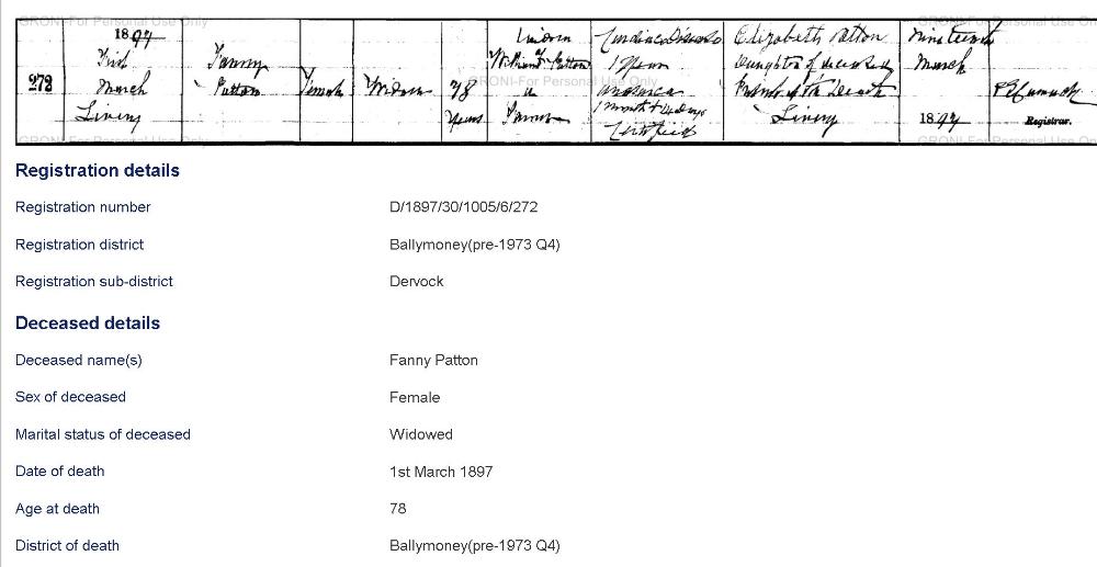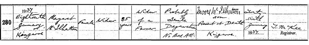 Margaret PATTON, daughter of William PATTON (1818-1896) and Fanny MOORE (1819-1897), was born in 1856 in Stranocum. She died on January 18, 1937.4,5 She and William John MCILHATTON had the following children: