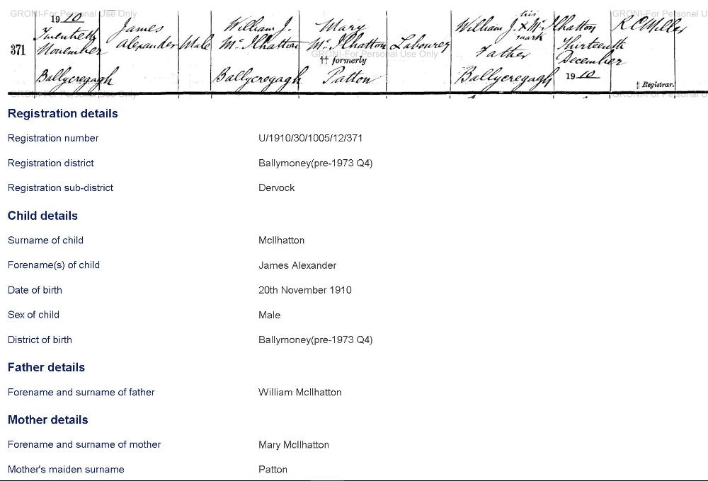 10. Alexander MCILHATTON, son of William John MCILHATTON and Margaret PATTON, was born on June 19, 1884 in Gortreighy.3 He died on August 16, 1961.