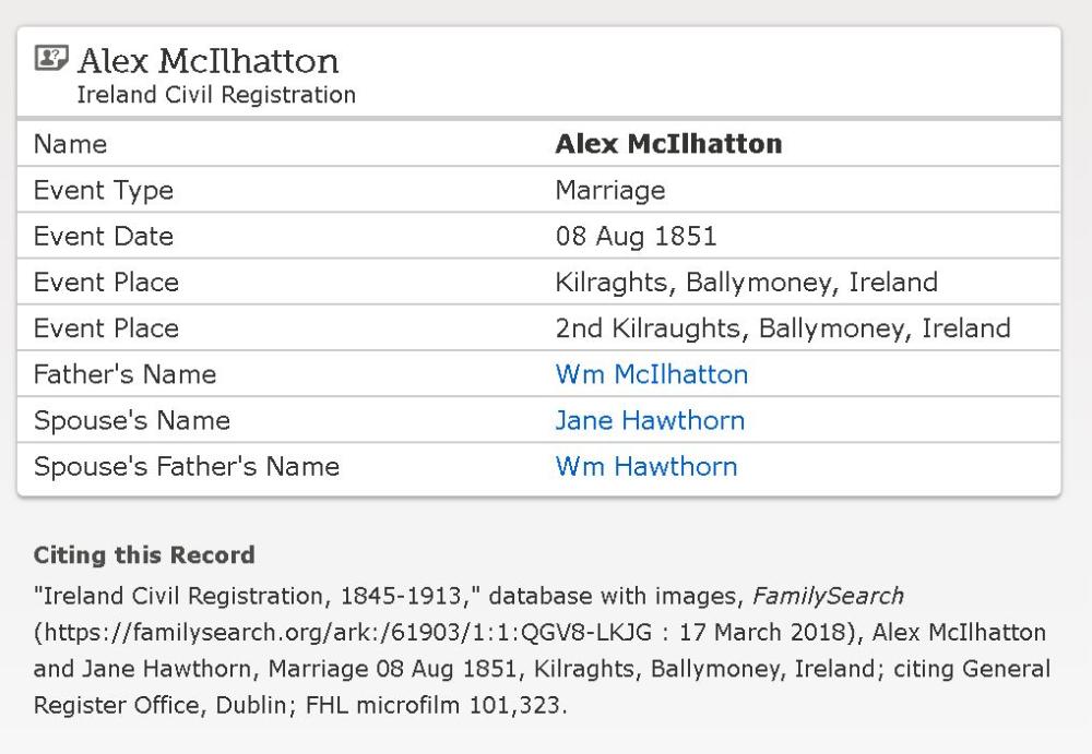 56. William John MCILHATTON, son of Alexander MCILHATTON and Jane HAWTHORNE, was born in 1856 in Stranocum. He married Margaret PATTON on January 10, 1878.3 He married her on January 19, 1878 in St James Presbyterian.3 He died on September 13, 1898.5