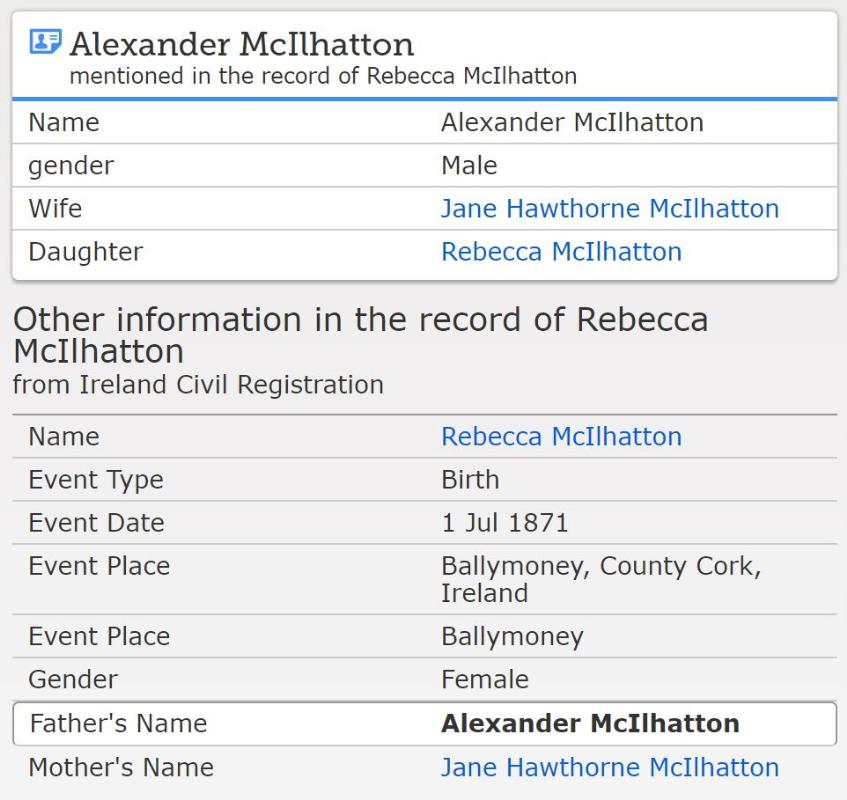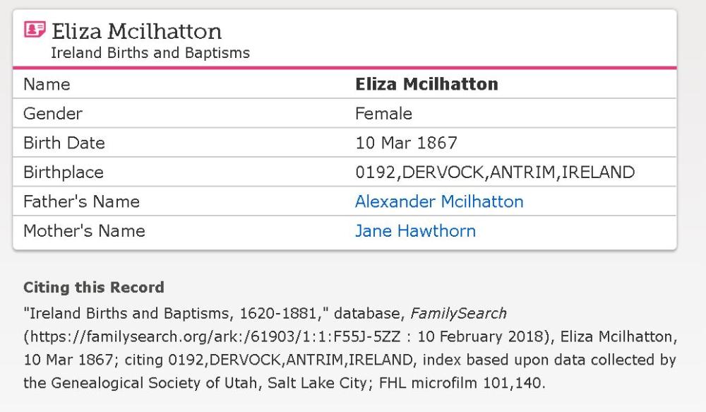 57. Eliza MCILHATTON, daughter of Alexander MCILHATTON and Jane HAWTHORNE, was born on March 10, 1867 in Kingariff.3 She died.6
