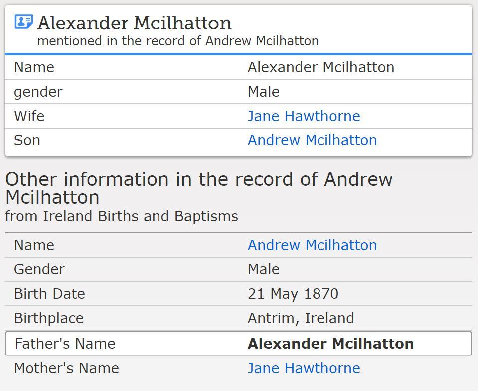 58. Andrew MCILHATTON,5 son of Alexander MCILHATTON and Jane HAWTHORNE, was born on May 21, 1870. He died on October 2, 1949 in Yanco Australia.10