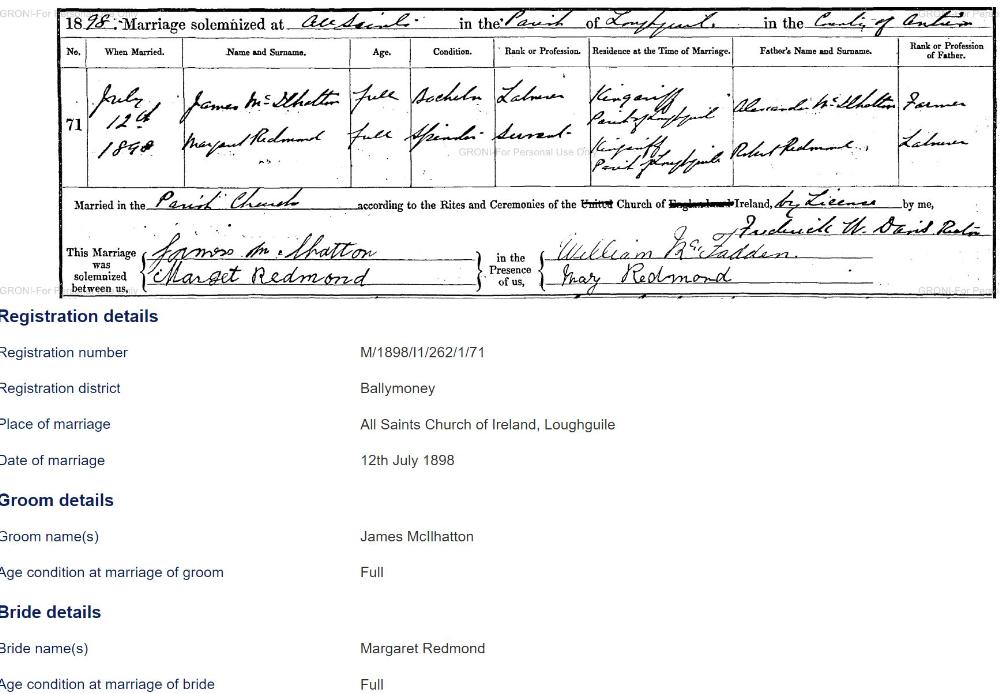 9. William James MCILHATTON, son of William John MCILHATTON and Margaret PATTON, was born on July 8, 1882 in Gortreighy.3 He married Margaret REDMOND on July 12, 1898 in All Saints Loughguile. He married Mary PATTON on January 11, 1910 in Billy Parish Church. He married her on January 11, 1910 in St Patricks CoI Ballymoney.3 He married Hannah PATTON on January 14, 1932 in Bushvale Presbyterian. He died on September 22, 1950 in Clintyfinnan.5