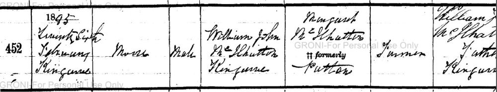 William John MCILHATTON, son of Alexander MCILHATTON (1825-1891) and Jane HAWTHORNE (1827-1892), was born in 1856 in Stranocum. He died on September 13, 1898.5 He and Margaret PATTON had the following children: