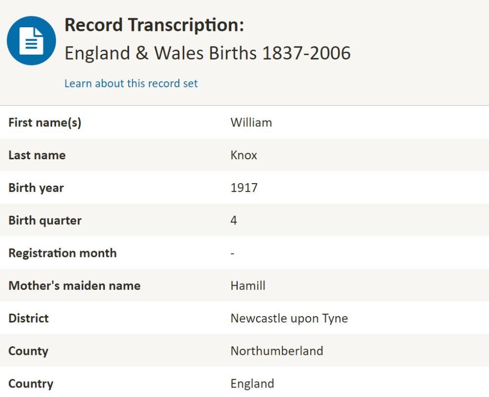 William KNOX, son of Archibald KNOX (1868-1934) and Alice HAMILL (1884-1933), was born on November 17, 1917.7 He died on November 15, 2007. He and Agnes MCILHATTON had the following children: