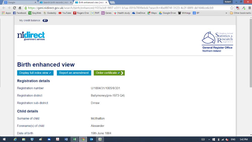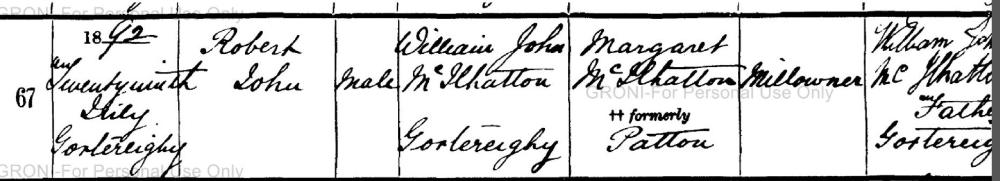 14. Robert MCILHATTON, son of William John MCILHATTON and Margaret PATTON, was born on July 29, 1892 in Gortreighy.3 He died on July 1, 1916 in WWI.